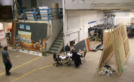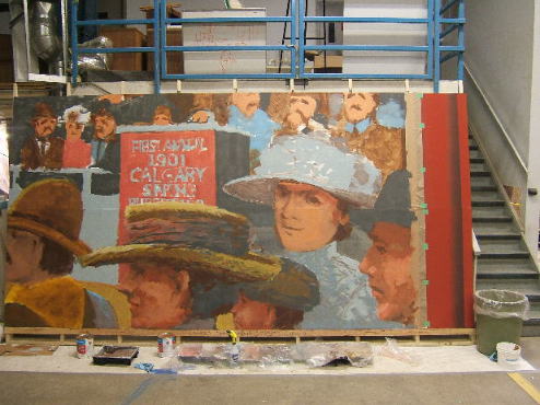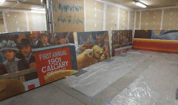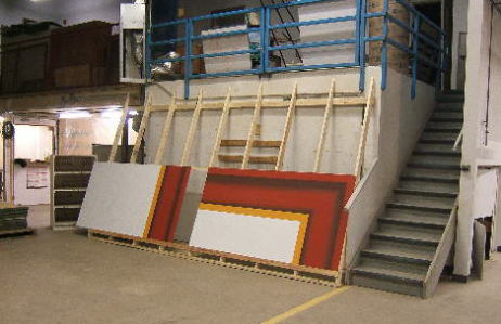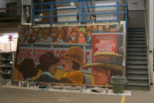 | Easels were constructed for the three mural projects to be undertaken in this space. Each easel would hold four panels at once, 2 wide, 2 high, lying horizontally. Four panels of the Bull Sale mural can be seen on the left. | ![]() |