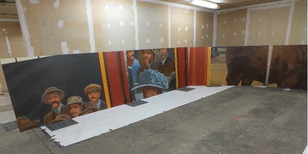 | The mural was done in December, 2012. Pictured here are two 4 ft.by 8 ft. panels on an 'easel' which would hold four panels. These two panels show parts of the 'faux' frame being painted. . |