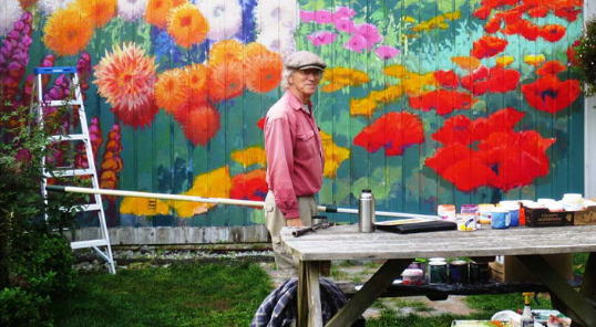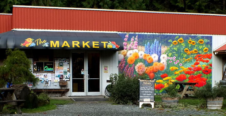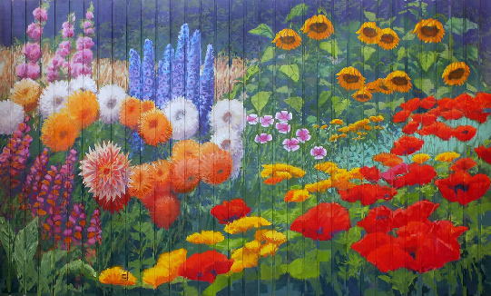 Daystar Market Mural revisited This is a re-paint of the 1999 mural. see "Flower Garden Mural". Size: 12 ft x 20 ft Location: The Daystar Market, Galiano Island BC Client: The Daystar Market Surface: Rough sawn board and batten siding