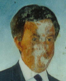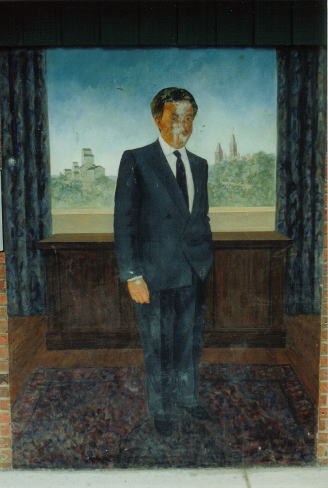 We tried to give our subject as benign an expression as possible in the hope of warding off future vandalism. A few hours work restored the mural. |